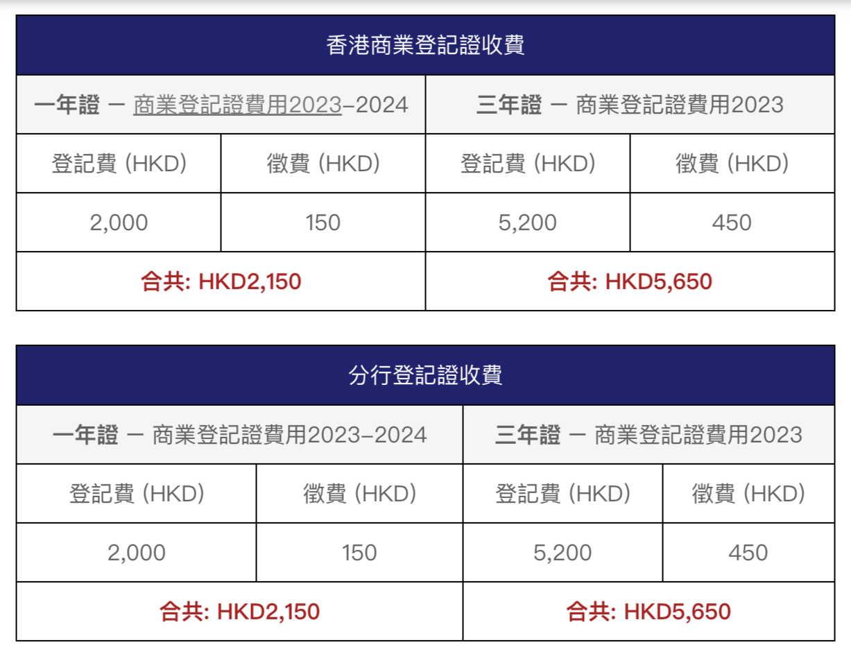 自2023年4月1日起,香港商業登記證(一年證)的總費用為HK$2,150,三年證的總費用為HK$5,650。