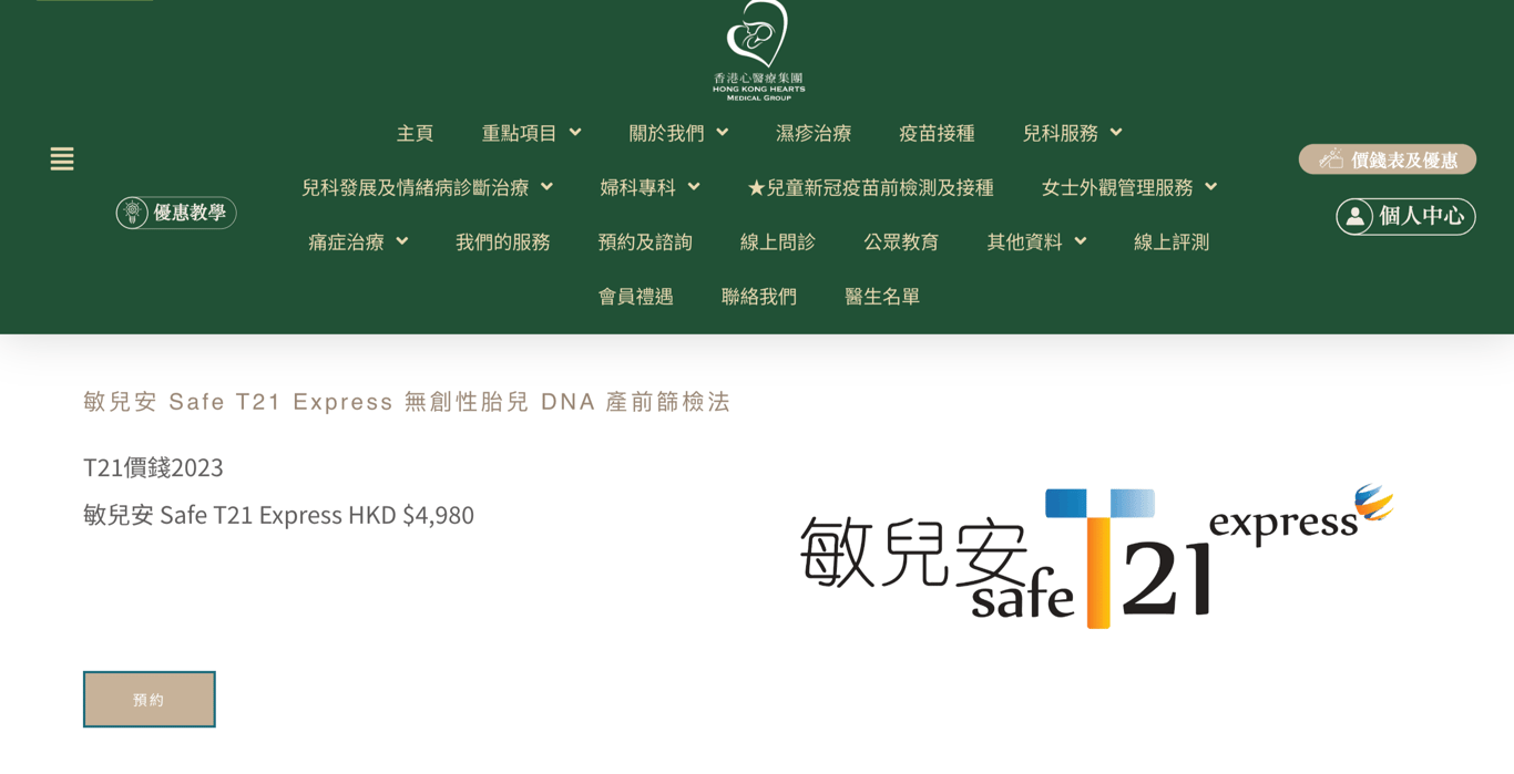 檢測項目價格(HKD)敏兒安 Safe T21 Express$4,980其他無創性檢測$6,000-$8,000